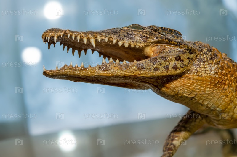 Чучело маленького крокодила с открытой пастью на столе