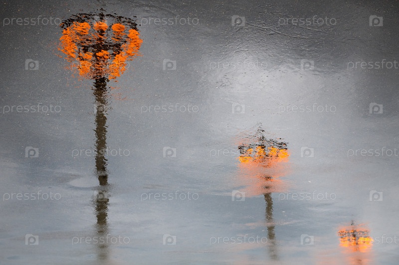 Фонари на центральной аллее Выставки достижений народного хозяйства (ВДНХ) отражаются в лужах дождливым весенним днем