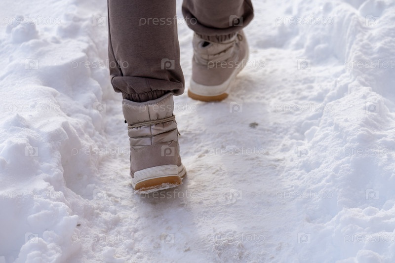 Человек ходит по снегу в ботинках и штанах