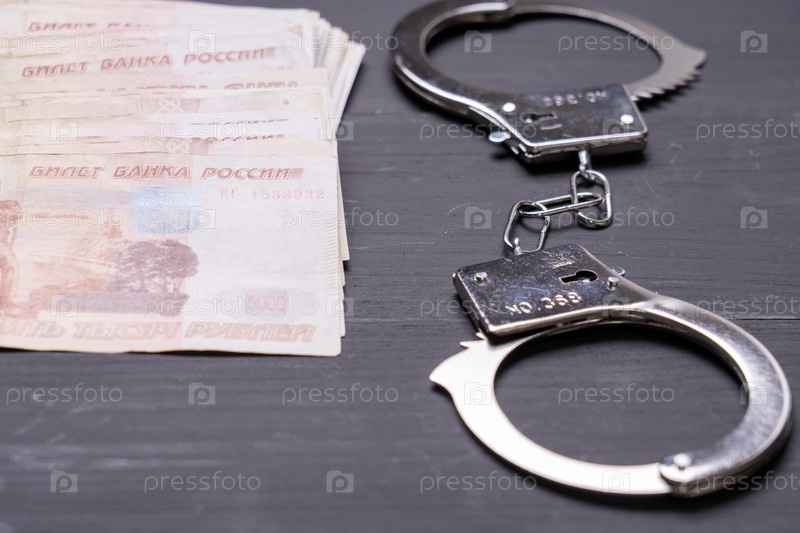 Пара наручников лежит на столе рядом с кучей денег