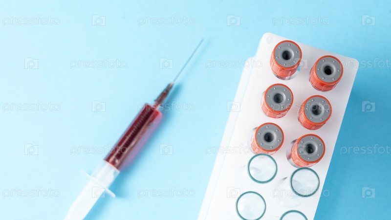 Шприц с красной жидкостью в нем находится рядом с подносом образцов крови