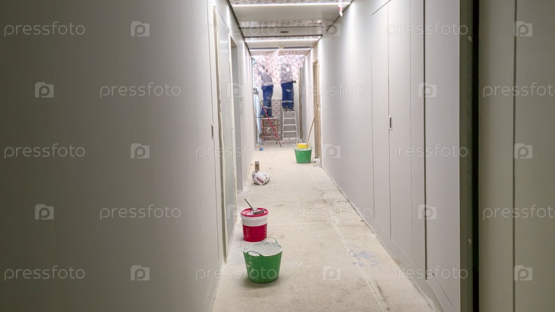 Коридор на стройплощадке, процесс покраски стен, внутренние отделочные работы, строительный проект, реконструкция интерьера здания