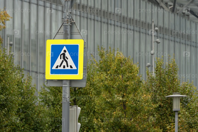 Знак пешеходного перехода находится на столбе рядом с улицей