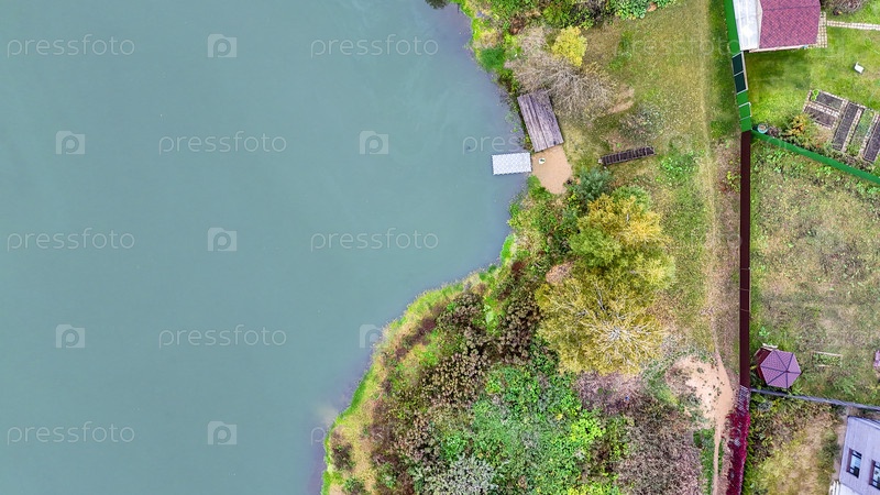 Вид на озеро с причалом и домом на заднем плане