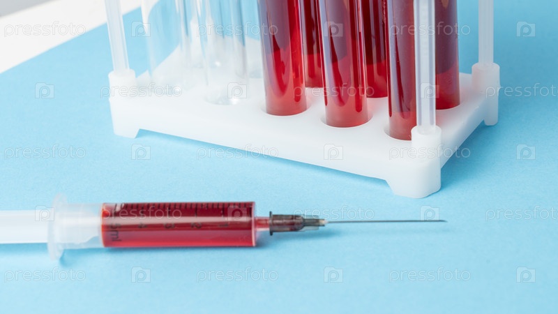Отбор образцов крови человека для анализа, шприц с кровью и пробирками, общий анализ крови