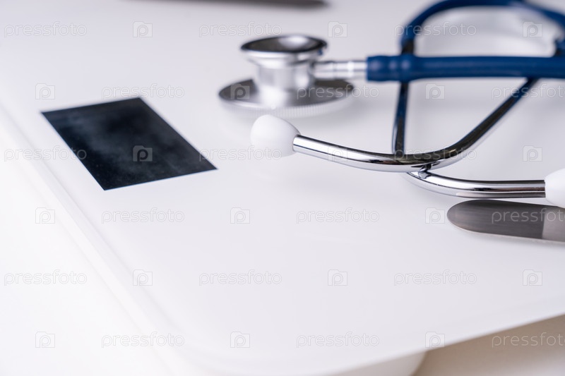 Современные белые электронные весы со стетоскопом, взвешивающие отношение массы тела жировой ткани к вестибулярной. фото высокого качества