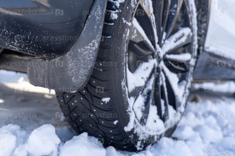 Снежная сельская дорога с автомобилем в зимний день, крупный план. Пространство для текста. Автомобиль на зимней заснеженной дороге на снежной дороге