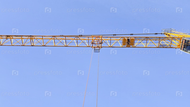 Желтый строительный кран, мощное подъемное оборудование, активное строительство зданий, высокоподъемные операции, механизация процесса строительства, крупные строительные проекты и сооружения