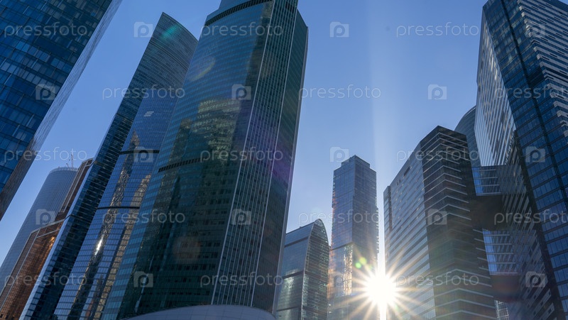 Москва, 30 декабря 2025 года, небоскребы в лучах голубого солнечного света, панорама большого города, утреннее или послеобеденное солнце, отражение архитектуры мегаполиса, современная городская среда, динамика городской среды