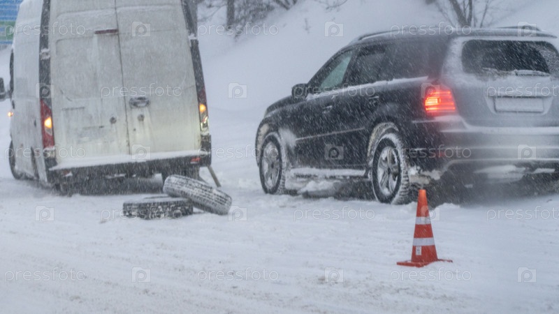 Поломка на зимней дороге. Две машины на обочине дороги. У автомобиля сломана шина. ДТП на снежной дороге на шоссе