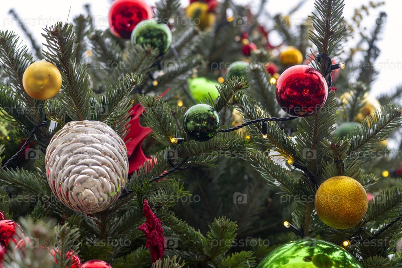 Рождественская елка на городской улице украшена красочными игрушками