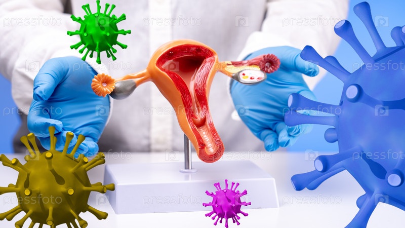 Концепция вируса у женщины. вирус папилломы человека. женская репродуктивная система гинеколога-акушера и иллюстрация вируса разных размеров и цветов