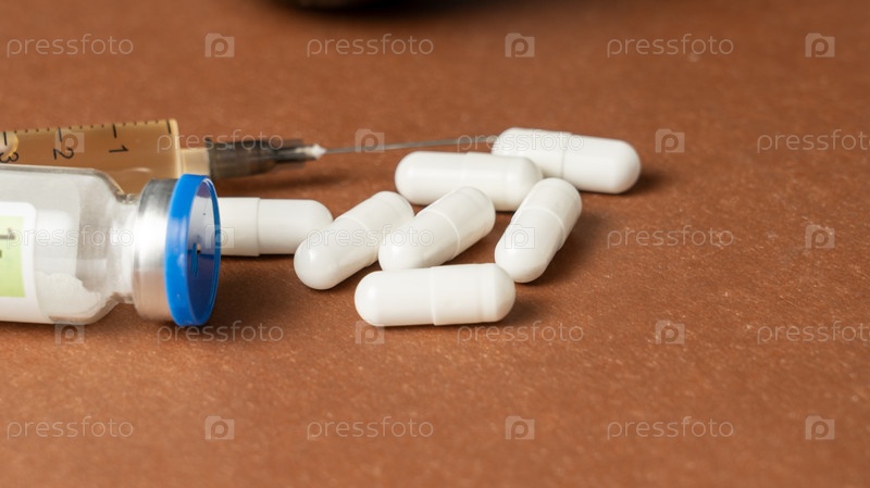Белые лекарственные капсулы - бутылка с порошкообразным препаратом и шприцем