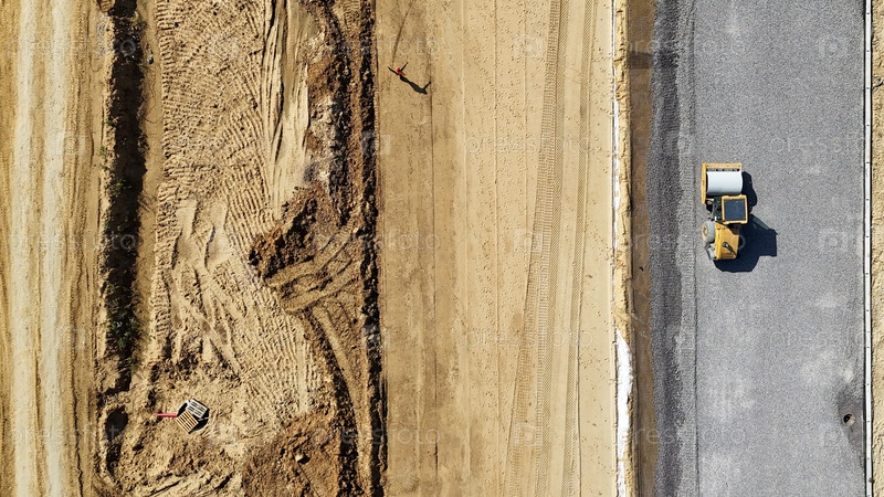 Дорожный ролик наносит удар по гравийной базе во время строительства дороги вид сверху