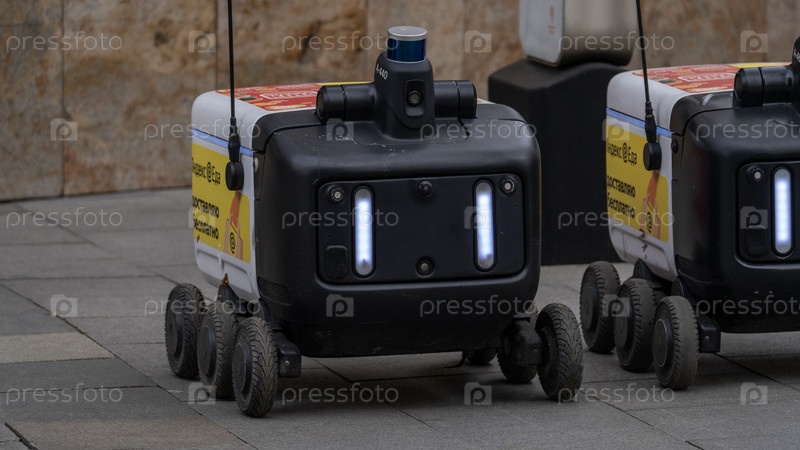 Москва, 30 декабря 2025 года.Два робота с синими огнями на них находятся на тротуаре