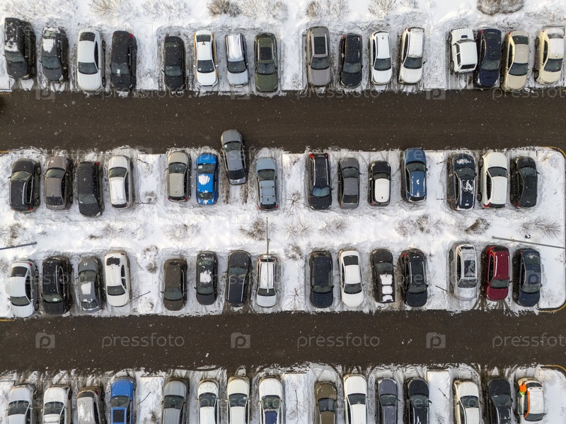 Цветные машины на заснеженной парковке зимой