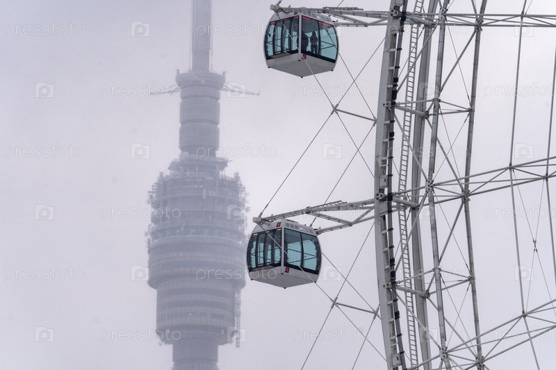 Москва, 30 декабря 2025 г. Колесо обозрения "Солнце Москвы" и Останкинская телебашня Ближайший план каюты с колесом обзора на фоне московской телевизионной башни в ВДНХ Виды Москвы