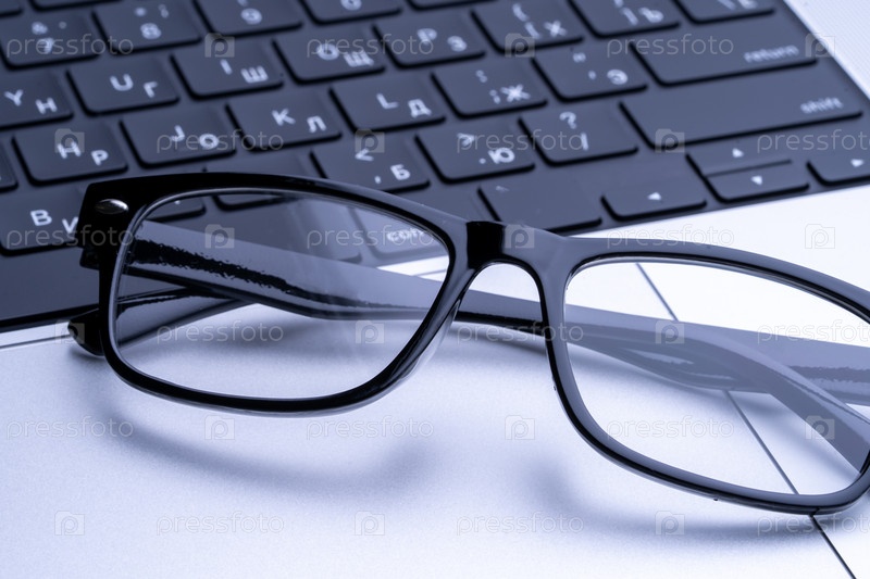 Очки с черным обрамлением для зрения на клавиатуре ноутбука