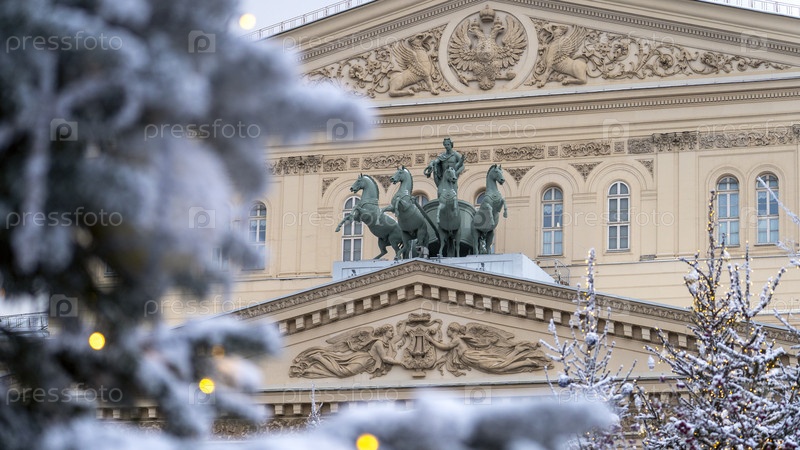 Москва, 29 декабря 2025, Главный вход в Большой театр на фоне рождественских украшений.В канун Нового года Большой театр в Москве украшен елками