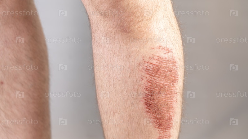 Тяжелая травма ноги у мужчины после падения. на ноге мужчины есть красная пятна, которая скорее всего является ожогом или синяком