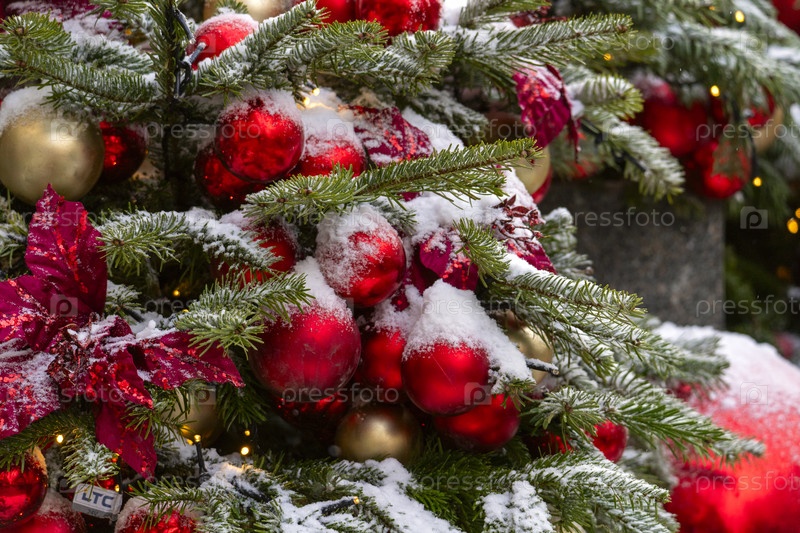 Рождественская елка, покрытая красными и золотыми орнаментами и снегом