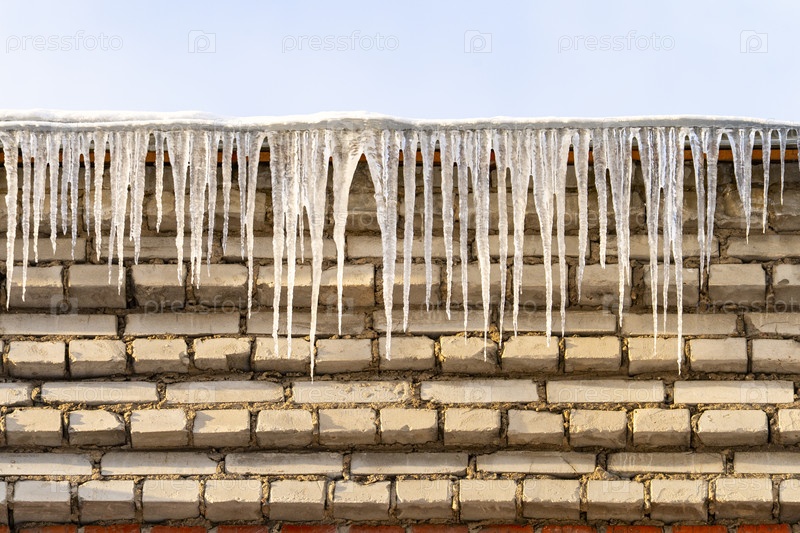 Ледники на крыше зимой, оттачивают. Красивые ледники на зимней крыше в ближайшем плане