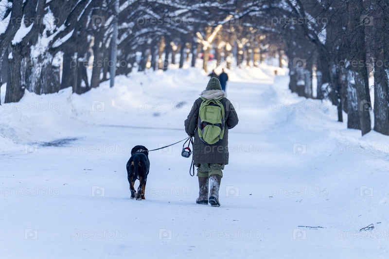Мужчина гуляет со своей собакой в снегу