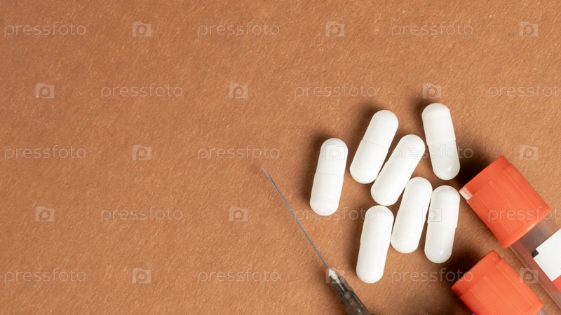 Контейнеры для таблеток и шприцев. капсулы белой медицины Шприц Анализ крови Трубы top view