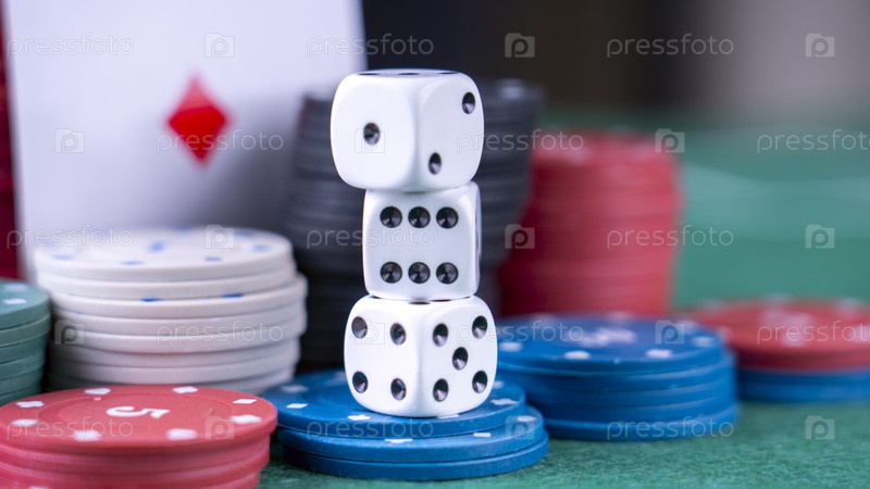 Куча фишек для покера и куча костей на зеленом столе