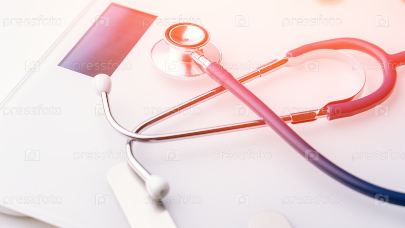 Медицинский стетоскоп и электронные весы - это концепция здорового образа жизни, стетоскоп, медицинское понятие, место для копирования