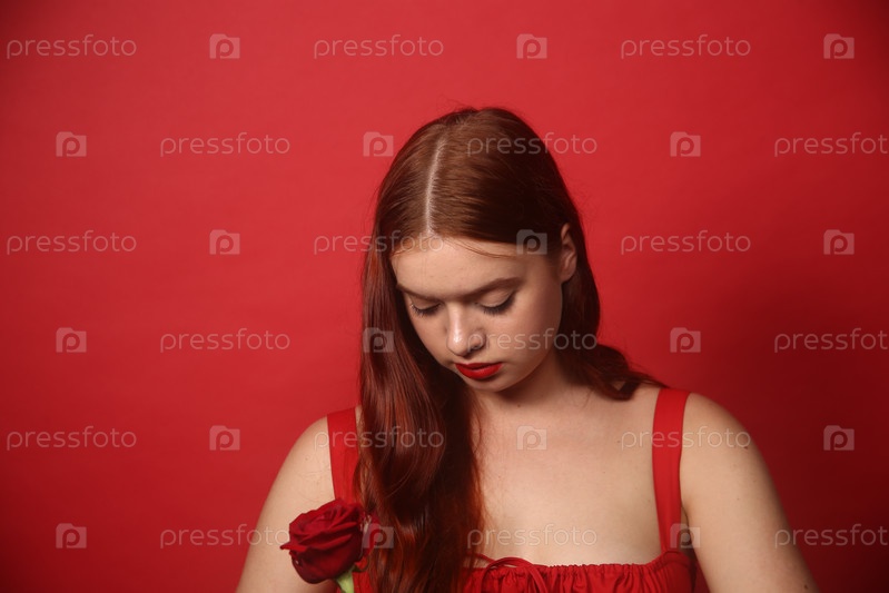 Красивая девушка в красном платье позирует на бордовом фоне. Международный женский день 8 марта