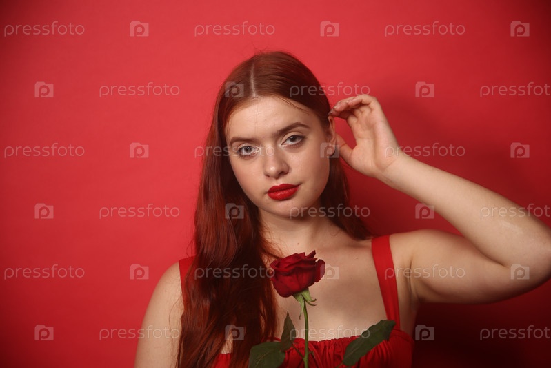 Красивая девушка в красном платье позирует на бордовом фоне. Международный женский день 8 марта