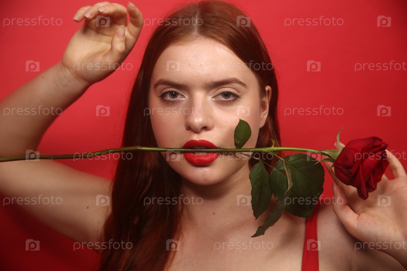 Красивая девушка в красном платье позирует на бордовом фоне с розой во рту. Международный женский день 8 марта