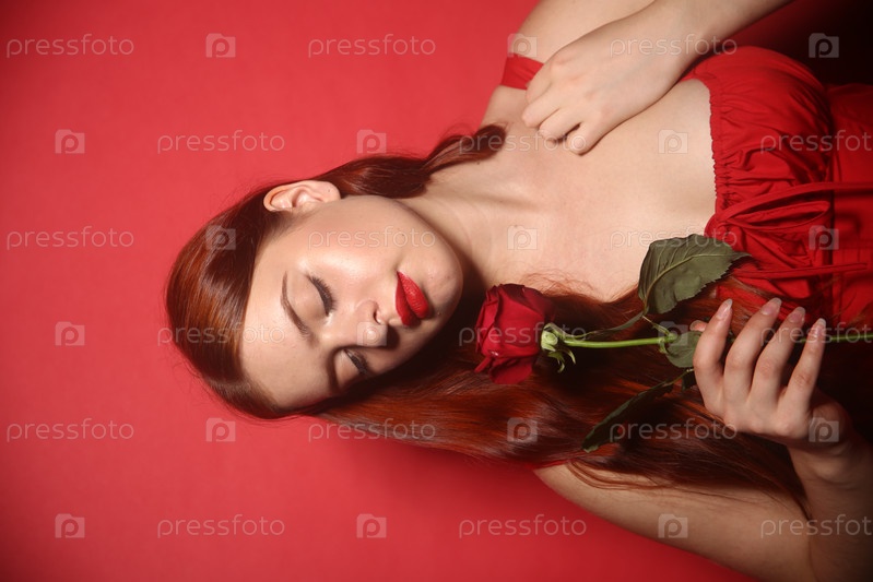 Красивая девушка в красном платье позирует на бордовом фоне. Международный женский день 8 марта