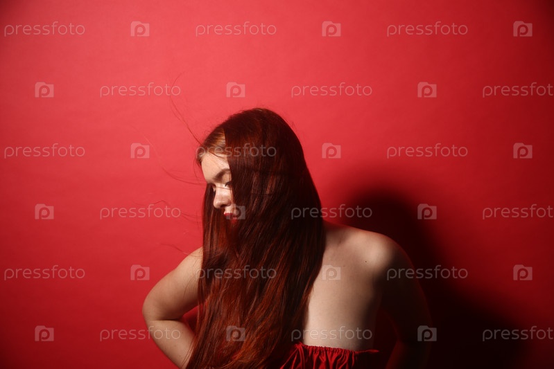 Красивая девушка в красном платье позирует на бордовом фоне. Международный женский день 8 марта