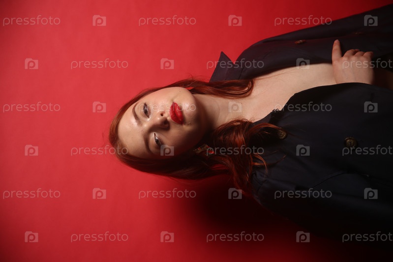 Красивая девушка в красном платье позирует на бордовом фоне. Международный женский день 8 марта