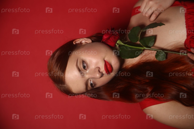 Красивая девушка в красном платье позирует на бордовом фоне. Международный женский день 8 марта