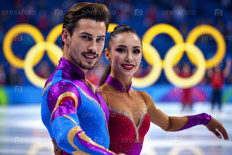 AI Generative Женщины и мужчины лыжники катаются на коньках, зимние Олимпийские игры пара фигурное качение соревнование