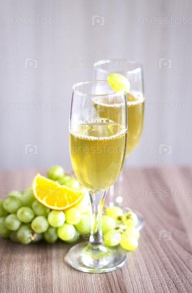 Игристое белое вино брют с виноградом и апельсином на столе. Питание и напитки