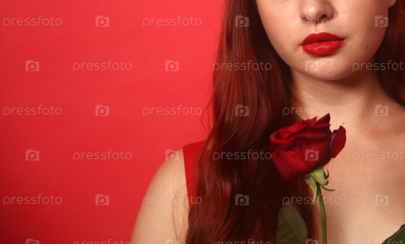 Красивая девушка в красном платье, с накрашенными губами позирует на бордовом фоне. Международный женский день 8 марта