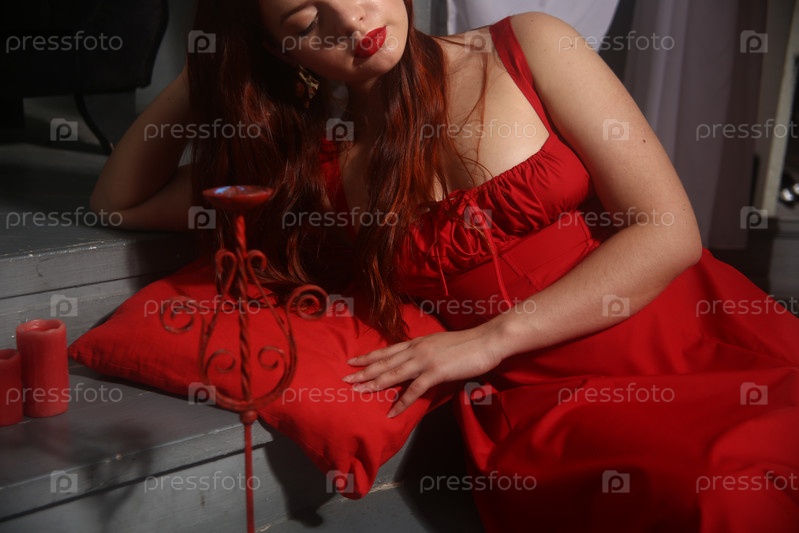 Красивая девушка в красном платье позирует на лестнице с бордовой подушкой под рукой и свечами. Международный женский день 8 марта