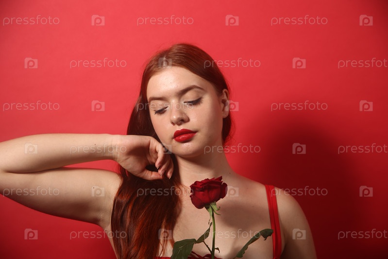 Красивая девушка в красном платье позирует с алой розой в руке. Международный женский день 8 марта