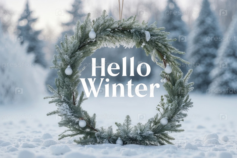 Баннер поздравительной открытки с надписью Здравствуйте, зима на фоне снежного леса AI Generative