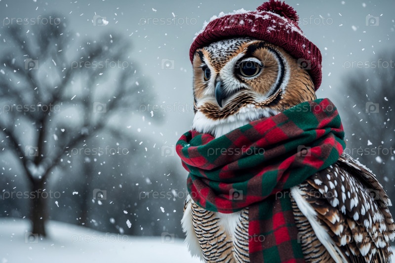 Портрет совы в вязанной зимней одежде, шляпе и шарфе, животное во снежных дождях зимой AI Generative