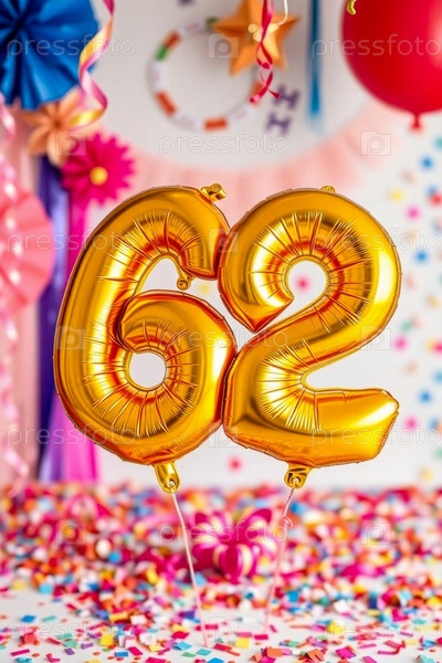 Гелий день рождения воздушный шар номер шестьдесят два, золотые буквы фигура 62 праздник праздничный фон