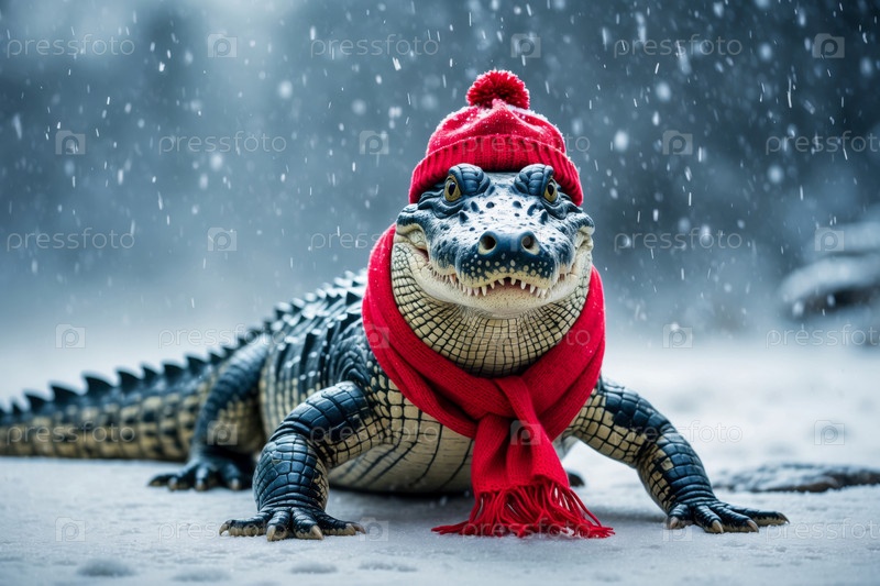 AI Generative Портрет крокодила в вязанной зимней одежде шляпе и шарфе, животное в снежных дождях зимой