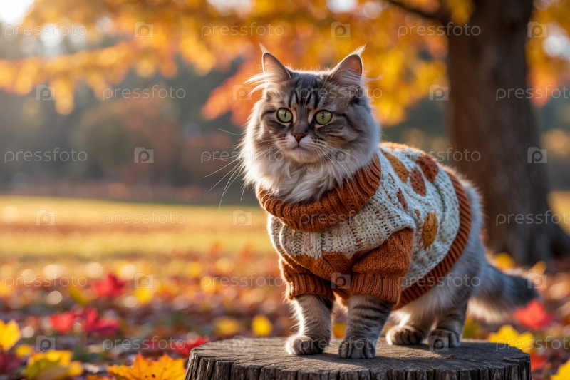 Кошка в трикотажном свитере на фоне осеннего леса, животное в красно-желтых листьях AI Generative