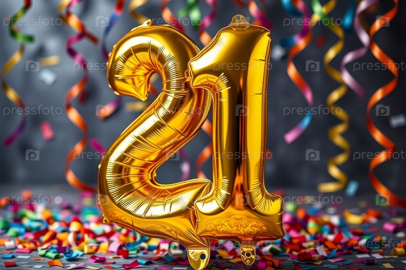 Гелиевый баллон на день рождения номер двадцать один, фигура из золотых букв 21 праздник праздничный фон