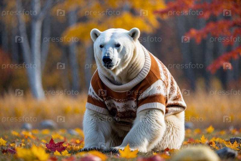 Медведь в трикотажном свитере на фоне осеннего леса, животное в красно-желтых листьях AI Generative