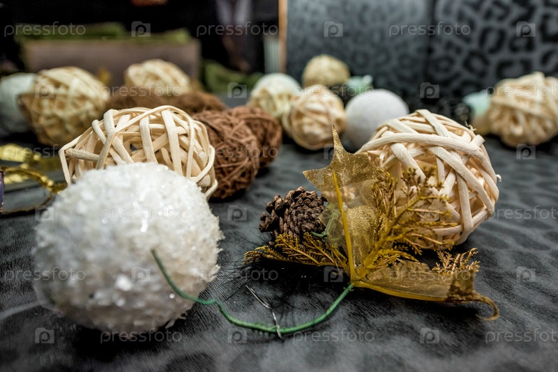 Различные плетеновые шары на столе, уютные домашние интерьерные детали в квартире